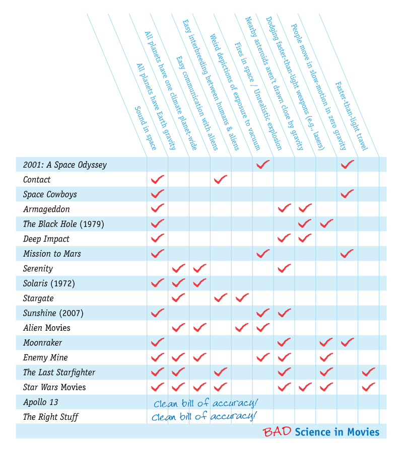 Which is a graphic from an io9 article reviewing the science in films. Brilliant. What’s really interesting is that the two films listed that aren’t 100% fiction, but are based on real events or softly fictionalized, are the only films that were accurate. Basically saying that if there’s fiction, the fact is tossed out the window.