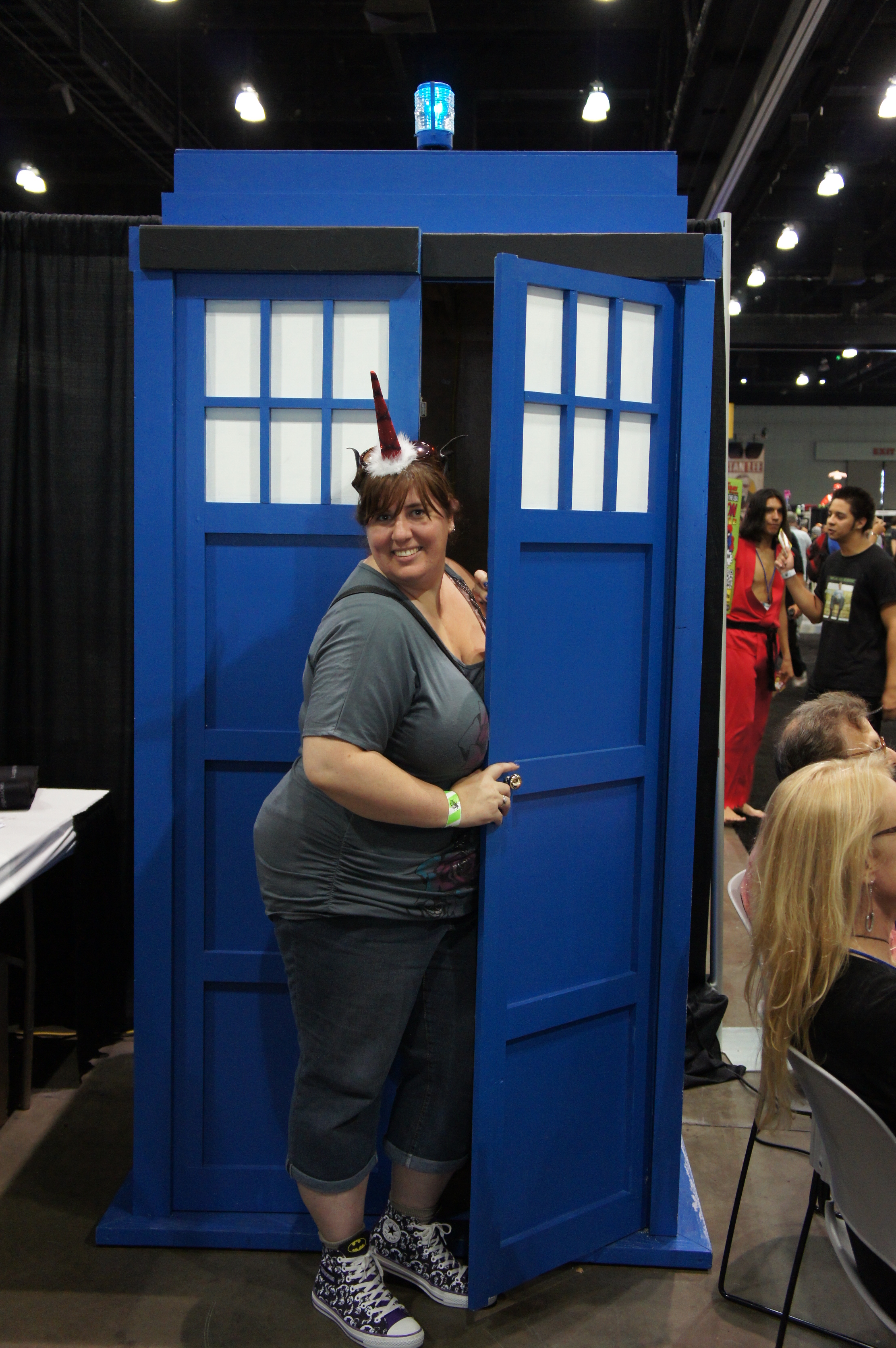 - Daphne Ashbrook of “Dr. Who” and “Star Trek: Deep Space Nine” fame brought her own full sized Tardis! She and her husband were very nice. She found Mike extremely funny & said he should be in show business. (This we already know!) She also has a daughter attending Julliard music school who is a talented singer/songwriter, as Daphne is herself. She let Mike hear a demo of her daughter singing so he gave her a Hard Six CD that she could “hear what it sounds like in the slums of music” lol!