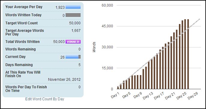 50,003 words. It was just confirmed. Just got through 50,000 words.