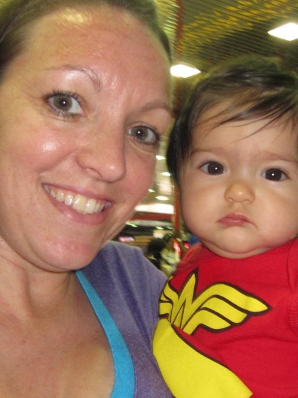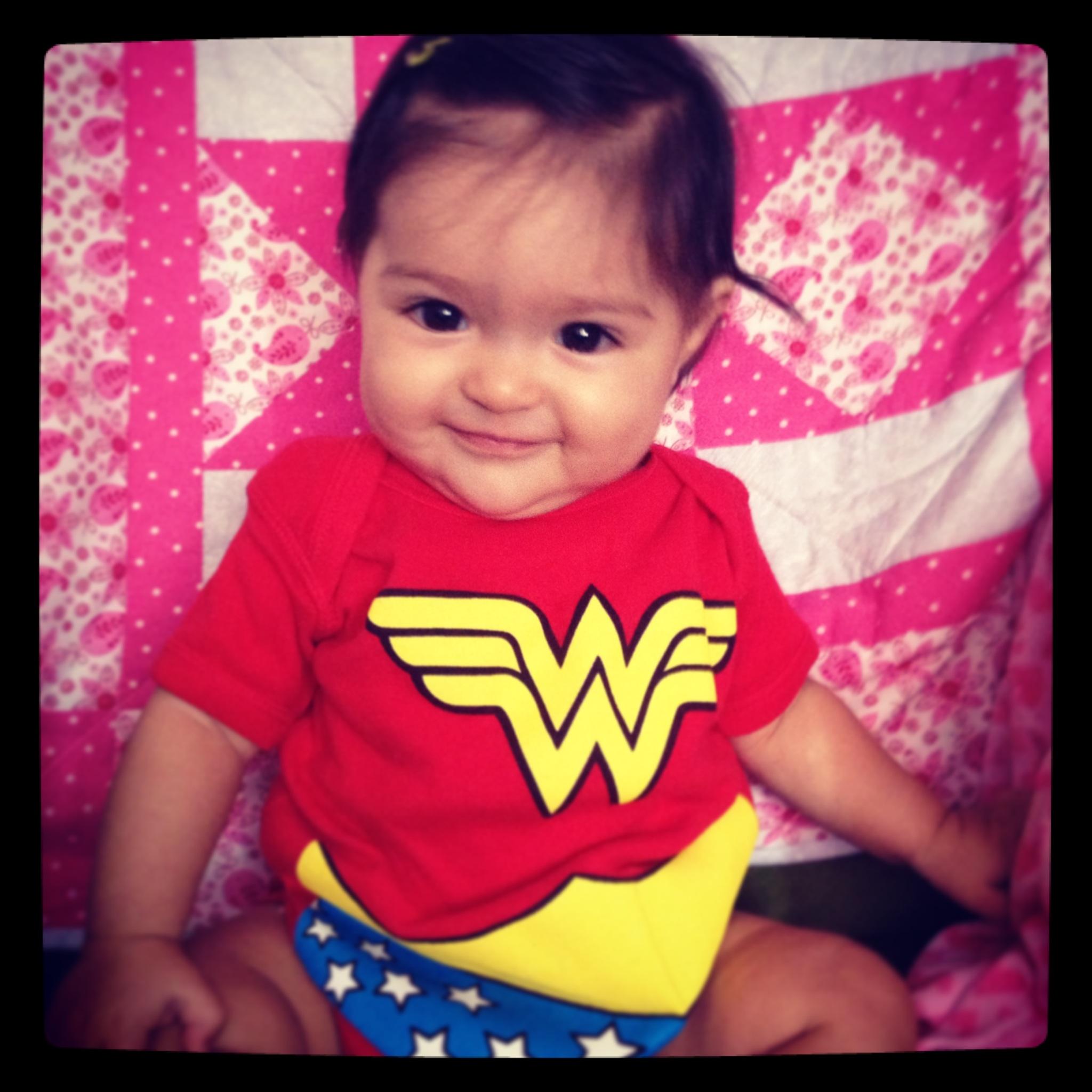 So obviously, my daughter needed to make some kind of statement.  I did have a onesie that said “The Babe with the Power” that my lovely friend, E gifted to us. I considered putting her in it, but for her first con, I really wanted something a bit more obvious. Wonder Woman. She’s strong; a staple in the comic community and my daughter has dark hair that would look fabulous against the wonder woman colors! So off to scour the internet I went in search of a onesie that would be perfect for my daughter. It took a while, actually, it took until a week before the con before I found the perfect onesie, and to my surprise it even came in on time!