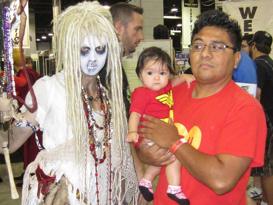 There were no meltdowns from either my daughter or myself. Everything I brought proved necessary. The con was expanded this year and separated on two different floors. The stroller was definitely necessary with all the walking we did but not needed for the crowds as it was spaced out enough that we didn’t hit any major “traffic jams”. Eventually my daughter became tired and the carrier proved useful as she didn’t want to sleep in the stroller but wanted to be held and snuggled. She was able to nap peacefully and I didn’t feel like my arms were going to fall off in the process. I didn’t expect it to be so cold at the con, so packing a blankie was perfect because she actually was chilly in her stroller. It turned out we were so overwhelmed with the size of the convention that we didn’t pay attention to where I could sit and nurse, so the bottle came in handy and her father was able to walk and feed her without any problem. We posed for pictures (well I made her father pose) with many people dressed in costume. My beautiful baby wasn’t afraid of anyone and simply looked around and babbled happily to herself the whole time.