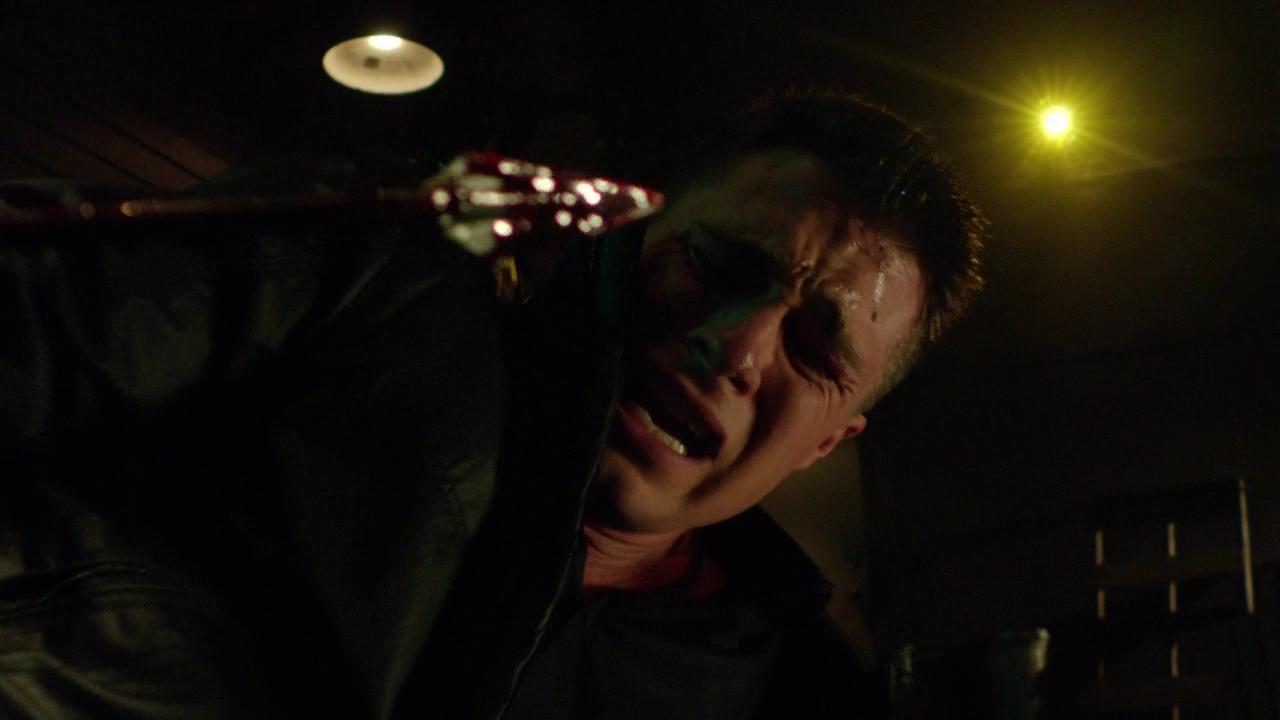 “Please save my friend.” While Felicity’s still upset with Ollie, he does try to fix things by inviting Barry to the party, thus both Barry and Felicity are happy. Well, at least as happy as they can be until Barry’s superiors call him back to Central City immediately. Meanwhile, Felicity traces Blood’s henchman to an ARGUS supply shelter, and Ollie goes there, even after being warned not to fight him, because this guy is next to unstoppable. At the ARGUS shelter, Ollie fights the guy and summarily gets the crap kicked out of him. Felicity and Diggle get there to recover Ollie, who also has some unknown stuff in big syringes stuck to him that is probably now in his bloodstream. Diggle thinks about calling 911 to save him, but Felicity has another idea, which is to nab Barry on his way home, bring him to the Arrow cellar, and ask him to help save Ollie. Good one, Felicity, for waiting until the second date with Barry to make things awkward.