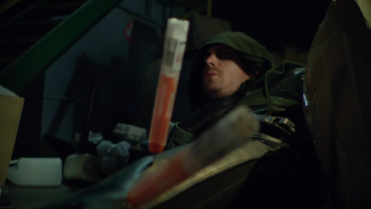 Something From The Past. Thanks to Felicity discovering some camera footage outside the labs, we see that Barry was right about one man carrying that huge centrifuge, and that bothers Ollie for a reason he keeps to himself. Also, Felicity is getting really chummy with Barry, so much so that she asks Barry to stay around to help find this mystery man, which makes Ollie think something is up with Barry. But he’s distracted by the mystery man hitting a blood bank and taking off with a truck of blood. He intercepts the masked man in a high speed chase, and before he’s tossed off the moving truck, Ollie stabs the man with an arrow. He brings that bloodied and severely bent arrowhead to be examined, and Diggle asks what he knows about this. Which brings us to…