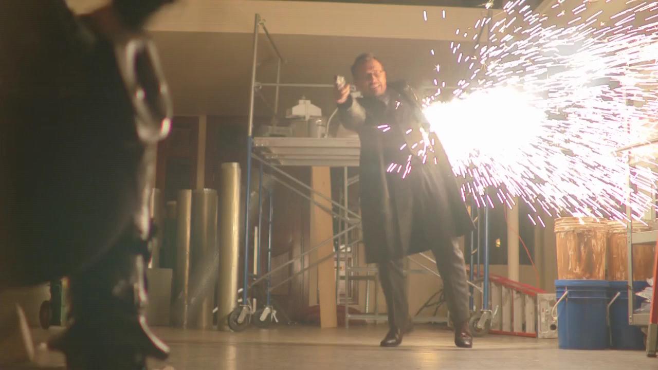 On A Clock. Two men break into a Kord Enterprises building, taking orders from someone on an ear mic who really knows a lot about timing. The men steal a package under guard and almost make it out clean, except one goes off his boss’ clock and ends up killing a security guard. The men escape to head back to their boss, a Mr. Tockman (played by go-to bad guy actor Robert Knepper), who’s not happy that one goon went off plan and in T-Bag/Prison Break style, shivs the man dead with a clock arrow. What was in the package he stole? Well, the equivalent of a skeleton key that can be used to open all kinds of tech, like say, bank safes. Keep that in mind as we go.