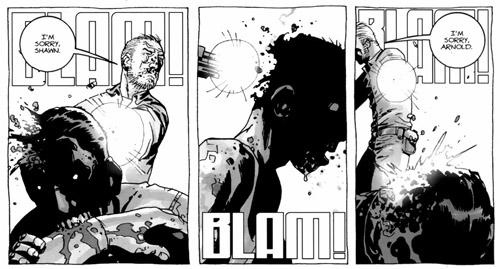 Rick and Hershel have a full blown argument over Rick’s killing of the sick people and Hershel’s keeping the zombies in the barn in case they get better. Hershel reveals that his son is in there and he can’t let him go. It takes Tyreese to come in between them and get them to cool down.