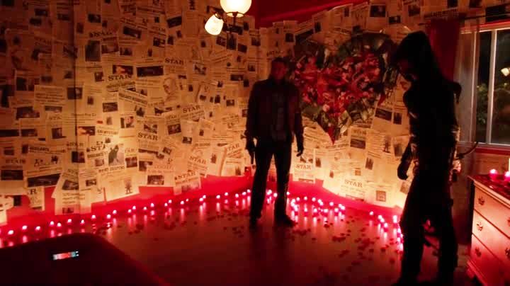 A Dead Hood. Quentin has something really interesting to show the Arrow: a dead Isaac Stanzler, dressed up as the Arrow! Well, that and an arrow that has a red spade tip. While Roy is trying to get past that “killing a cop under the influence of Mirakuru” thing, Felicity is getting offered a chance to join Ray Palmer at a job-related dinner, and dressed in an expensive dress. Let that sit for a moment, as Ollie figures out there’s a message inside the arrow: an apartment address. Ollie and Diggle arrive there and find a really creepy shrine to the Arrow (and oh yeah, that spade tipped arrow is a heart-tipped arrow, point of fact) and a ringing cell phone. Creepy redhead Cupid is calling, and wants to join Arrow in killing bad guys. In fact, she has a potential new victim in waiting: a tied up mobster with explosives on him!