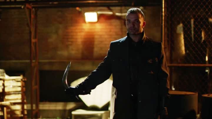 While most of Team Arrow is getting a dinner, a mobster is walking the streets until a guy in an overcoat stops him, saying he needs something from him. The overcoat guy whips out a boomerang looking blade which he throws and, surprise, comes back around to impale the mobster in the back! I’m starting to think it might be easier to find vigilantes in Starling City by staking out coat shops than anything else.