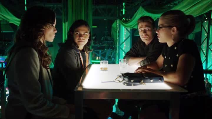 Having A Chat Or Two. While Diggle is at the hospital tending to Lyla, the support teams of Team Arrow and Team Flash are taking some reflective drinks in Verdant. Their conclusion: man, Starling City is a rough place to live in. Below in, fine, the Arrow Cave, Ollie feels responsible for unknowingly getting Lyla set up to be wounded. Barry reminds him despite all his moodiness of late this season, that Ollie can be more than just a grim vigilante. Oh, and some more good news: Boomerang was spotted at the train station. Suit up!