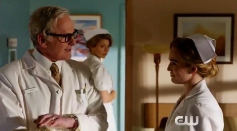 …Which we’ll get to later, because the Waverider arrives in the town the teens live in, Pleasant Falls, following a lead on Savage. This lead is the vanishing of those teens who ran into Savage, so the team breaks off into several groups: Ray and Kendra pretend to be a married couple in the teens’ neighborhood; Stein and Sara go in as doctor and nurse at the local hospital; Rip and Cold pretend to be federal agents; and Jax thinks he can talk to the girl who survived the crash. Of course, this is 1958, so there are some major hurdles for our team to cross in their undercover operations. Like for instance, Kendra being mistaken for Ray’s, ahem, “help”, and Jax getting hassled by the local prejudiced teens. Welcome to the 50’s!