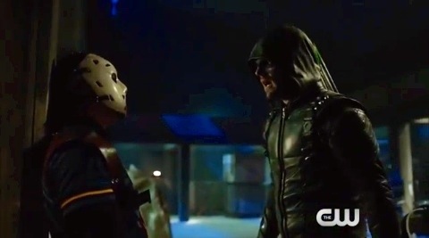 Balancing Anarchy and Order. In the present, Mayor Oliver Queen is due at a policeman’s gala…but is currently fighting a massive bomb wielding Anarchy! After putting ol’ Lonnie to sleep for the cops to collect, Felicity is remotely disarming the bomb, or trying to if that odd vigilante in a hockey mask wasn’t trying to do the same! Ollie’s having none of this guy, who we learn is called is called Wild Dog, and kicks him aside so Felicity can finish her job. After she does, Ollie decides to encourage Wild Dog to stop doing his thing by putting an arrow through his leg. And as we know, getting shot in the leg by Ollie is pretty much a job audition for the Team, which is only Ollie, Felicity, and Curtis now.