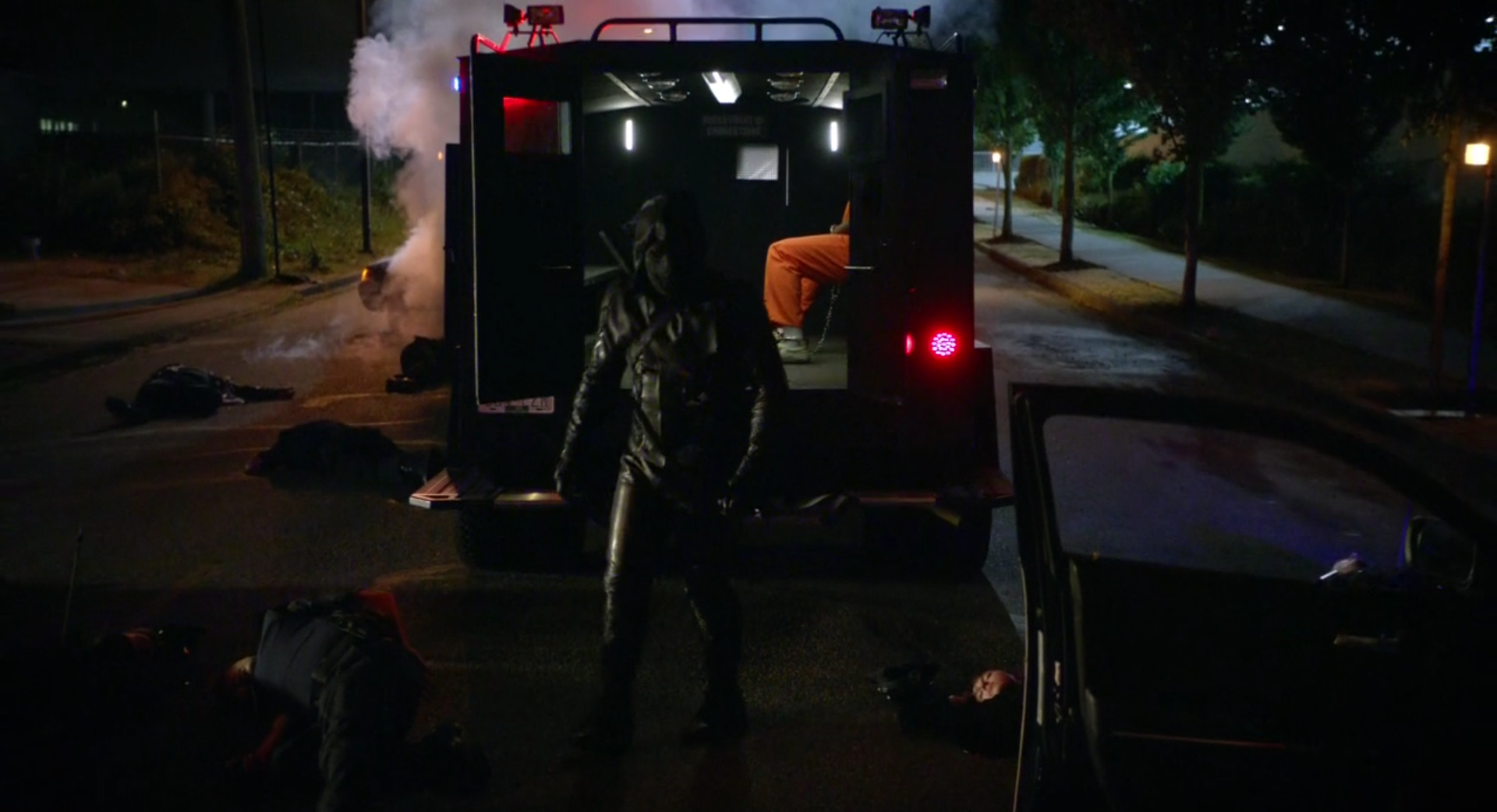 Church is being taken away to Iron Heights by a police convoy, that gets immediately attacked by Prometheus. Church knows who’s coming for him, and when Prometheus comes into the police van, Church offers a secret for his life: that the Green Arrow is Oliver Queen (which Prometheus there seems unmoved by hearing). Prometheus pays Church back by throwing a shrunken into Church’s neck, killing him!