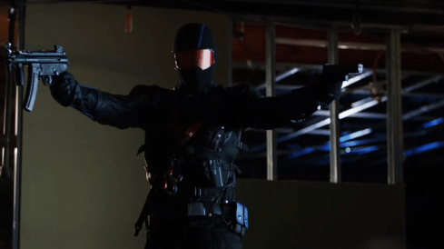 Back at the limo crime scene, Dinah finds a piece of Vigilante’s eye wear, and thinks it’s a clue to finding the mystery maniac. But, Adrian shows up and offers (I mean, insists) on taking the evidence to the police for her. A bit later, Vigilante is stalking outside the hospital, when Prometheus shows up, who is none too happy someone else wants to kill Oliver Queen before him. Vigilante vanishes after a brief rooftop fight, and Prometheus pops off his mask to reveal…