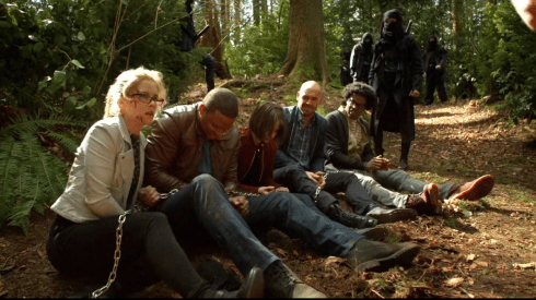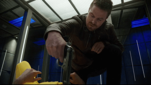 On Lian Yu, Quentin, Felicity, Diggle, Thea, and Curtis are being dragged somewhere by our evil band. Felicity knows Ollie is coming for them, but everyone else knows he can’t take on all these bad guys alone. Well, even if he does have Malcolm and Nyssa, Ollie is still overmatched. And he knows it.