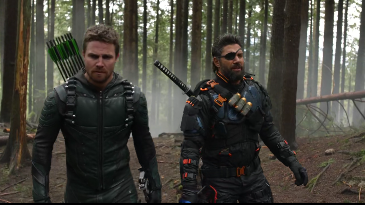 Out of Purgatory. At the ARGUS cell, Ollie is at Slade Wilson’s holding cell when the guard asks what’s happening. Well, Ollie tells the guy to get off the island right now, because he’s springing Slade and Digger Harkness (Captain Boomerang from season three) for a special mission. When the guard refuses, he gets knocked out by Ollie (which may be not for his own good, as we’ll see much later). Slade seems way more normal thanks to all that Mirakuru from their last encounter being out of his system, almost content to serve his time imprisoned, and asks why he would ask for his help (this is the guy who murdered Moira, you know). He explains he needs help to find his friends and family on the island, and to sweeten the pot, offers info on where Slade can find his missing son. It looks like we got a team-up! On the shore, Malcolm and Nyssa are getting gear out of their plane (and sniping at each other for obvious reasons), as Ollie returns with Slade and Boomerang. Before they can sit down to discuss what to do, a missile comes out of nowhere and blows up their plane. I guess Adrian found out the party guests have arrived. The group makes their way into the island, and Boomerang laments to Ollie why he doesn’t have any weapons, but the guy who murdered Ollie’s mom does. Ollie reminds him that if he doesn’t play ball, he won’t allow him to leave the island. Fair enough.