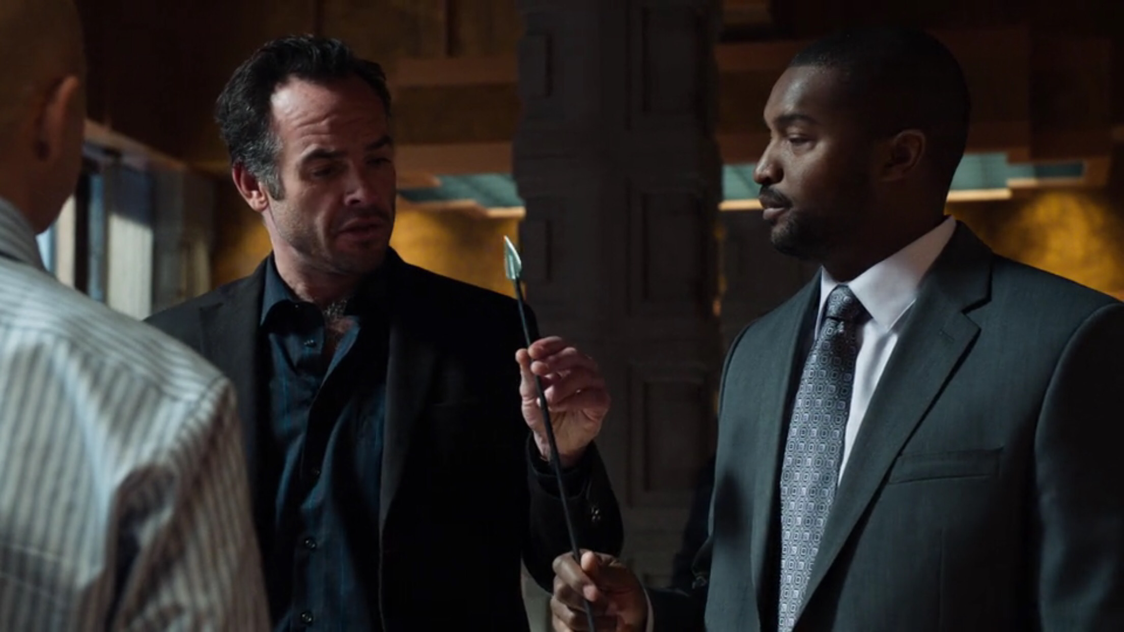 Ollie has to ditch Diggle again–by putting him in a sleeper hold!–and leaves to Hunt’s office. He goes through Hunt’s security detail, seems to miss hitting Hunt with an Arrow, and just escapes as Quentin and the cops bust in. The cops head across the street and shut down the party to find the “hood”, and all they find is Ollie there. Oh, and that money from Hunt is mysteriously gone, transferred to numerous plaintiffs in Laurel’s class action suit. That arrow that missed Hunt turned out to hack his financial network, and stole the money.