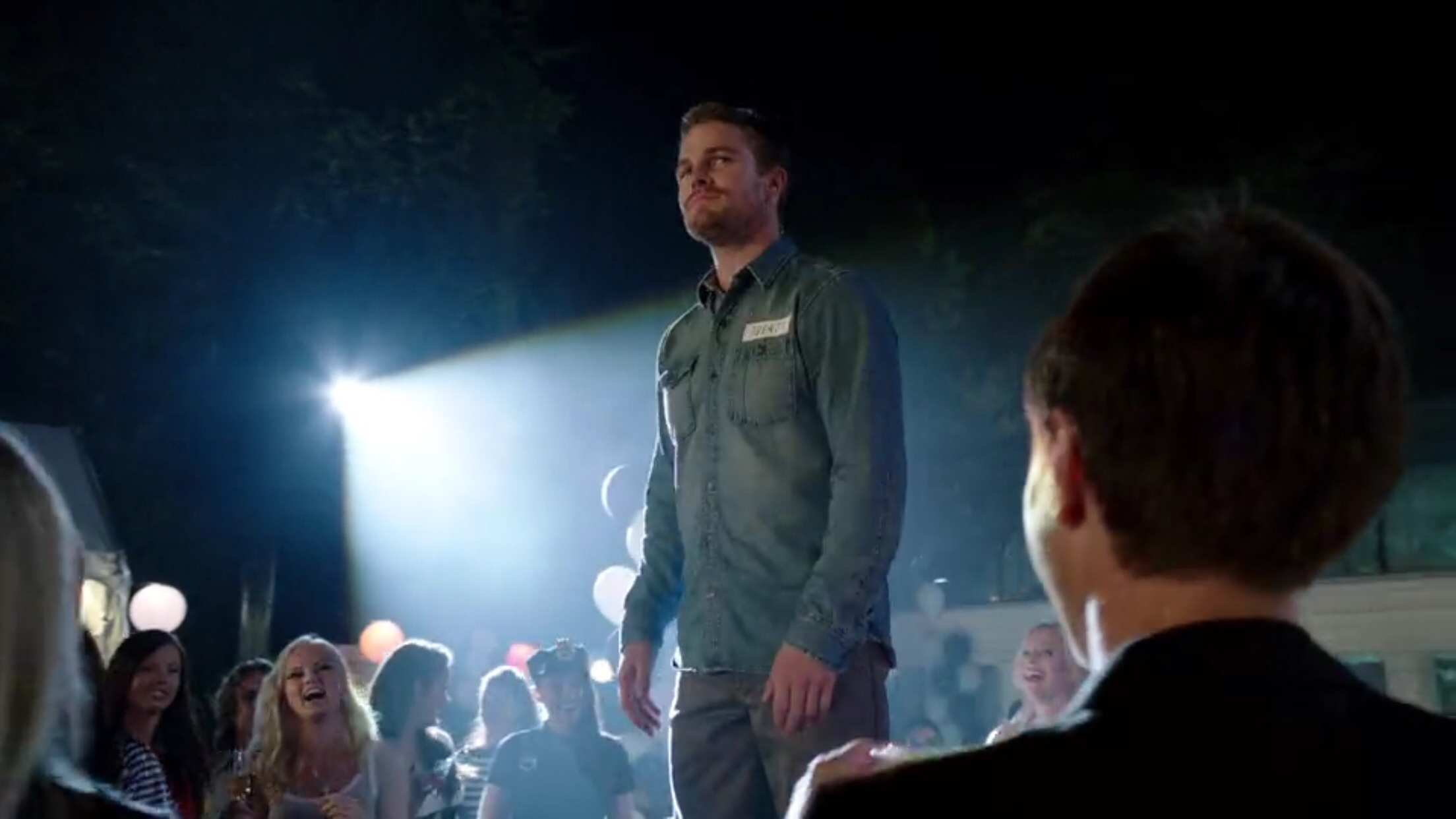 Ollie takes the polygraph test, and surprisingly passes it with flying colors. Quentin is still not convinced Ollie’s innocent, but shows up at Ollie’s little prison themed house party anyway. At the party, Ollie reveals to Diggle that this party is all a setup to have witnesses to Ollie being there…while the Hood stops that arms deal! How does that work? Well, Diggle gets to wear the Hood, which, he tells Ollie to not play him like that next time. So while Diggle wears that snug green hood as he stops Mueller’s arms deal, Laurel visits Ollie, and they have a little heart to heart about their issues regarding his vanishing. They almost make out right there before she decides to leave. And just as Diggle calls in to say the arms deal is stopped, a hitman in a waiter’s disguise comes in to kill Ollie! Quentin arrives to gun down the assassin in time, tipped off by damage to Ollie’s ankle GPS.