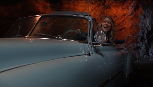 –Nice way to save the budget by having J’Onn’s spaceship also able to look like a 50’s open top roadster.