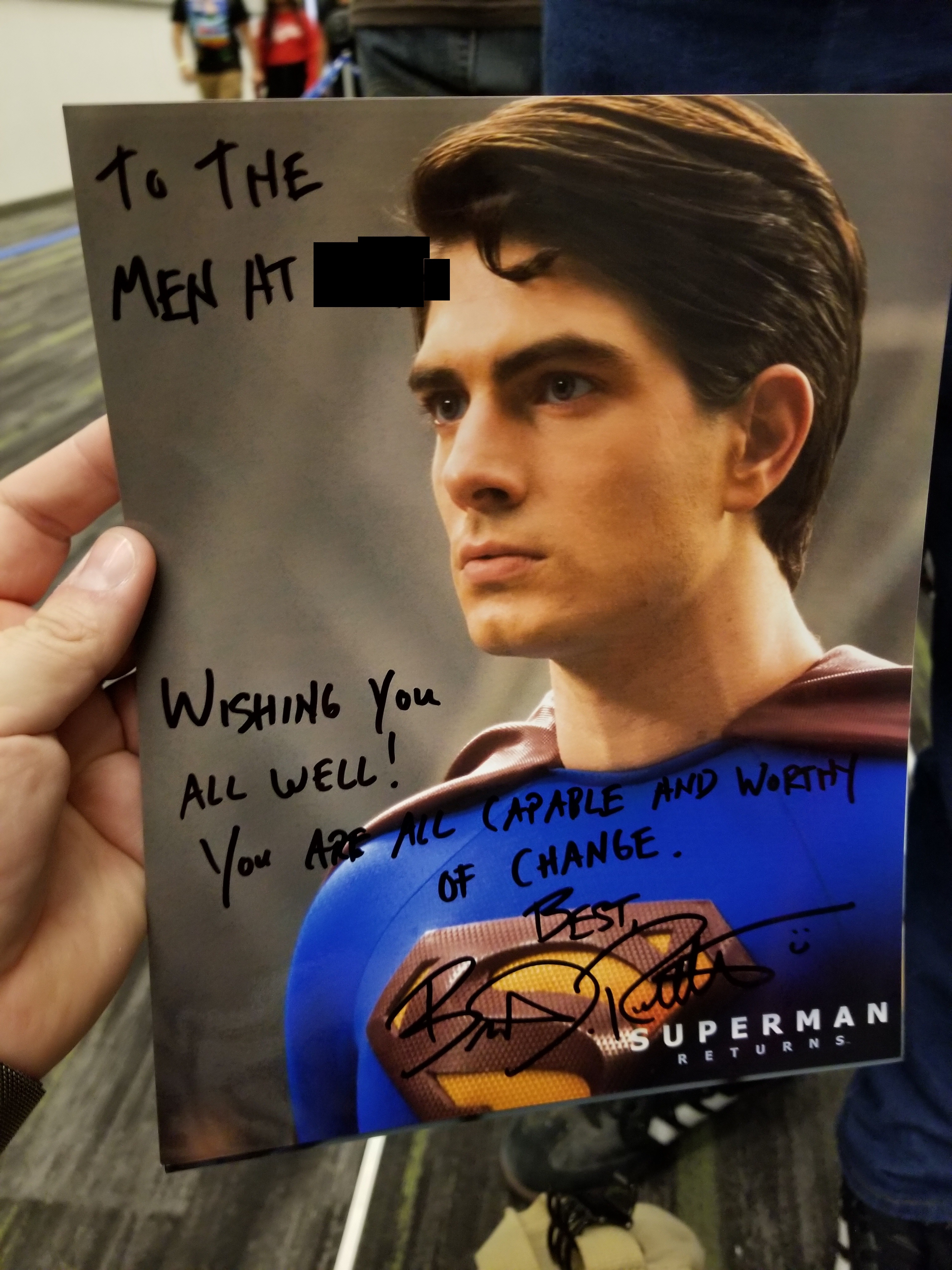 For the most part, that covers the events of the weekend. I would also like to share a very personal story- last year, I chose to do the photo op with Brandon Routh because he doesn’t do a lot of conventions and, well, it’s Superman. But I didn’t get an autograph. At one point when we walked by his booth, there was a short enough line that I decided to just do it and get the autograph. A bonus is that in my real life, I run a Cinema Therapy group in a prison that is currently watching Superman Returns, therapeutically. Yes, therapeutically. The first group I watched it with, a year ago, came up with a way to relate to the character of Superman- he’s been gone for 5 years, the woman he loves is with another man, that other man is raising his kid, and the world went on without him. The whole group was silent that first time and then they talked about how that fit them and how they respond to it. And I’ve used that to start a discussion each time I use the film. We also talk about Superman’s god complex and what gives him the right to act for justice, but that’s not my favorite discussion. So anyways, while Routh was signing a photo to me, I took the moment to share this information and explain how it is therapeutic (and fun) for my inmates. And we talked about offenders and the work we do in the prison to decrease recidivism and what not. He said he wanted to send them something, particularly to my group, and signed a photo from Superman Returns to them saying, “Wishing you all well! You are all capable and worthy of change.” I shared it with the group this week as we were wrapping up and they were all touched, impressed, and shocked- especially shocked that someone who isn’t staff or family thought of them- and they asked me to send their thanks back. I shared it with staff and no matter what their role (custody, mental health, or even office staff) everyone was thrilled that he had taken the moment to do this and put a lot of thought into the message. It was fun seeing the guys and the staff light up when they saw it. Needless to say, I’ve added the photo to my wall of inspiration and motivation in my office. Makes me smile when I see it and when I sit down with a client and get to share the story of it. Class act that Routh guy, really good guy- and that’s so nice to see.