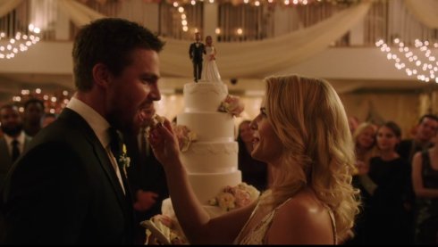 Public Reception. Friends and family of Oliver Queen and Felicity Smoak are having a wedding dinner to celebrate their recent union (well, they sure couldn’t do that thanks to how impromptu it was!). Felicity’s mom and (still criminal?) dad show up, Curtis has a drunken celebratory speech saved by Rene’s earnest congratulations, and Quentin gives Ollie his dad’s watch, as he’s the closest thing to a son he has (I’m sure Sara would have liked to get that watch, you know). That’s all good and everyone dances, but Quentin gets a call that should be alarming to Ollie. He tells Ollie that he has information on the trial against him, being that the star witness in this case is possibly a current member of Team Arrow!
