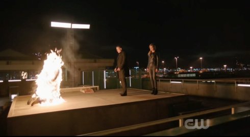 No Loser. Evil Laurel is happy that Diaz got his respect, but really would like to go home now (probably because it seems like a stretch for her to be gone from Quentin’s apartment that long without some red flags going off). But there’s one last thing Diaz has to do, and he goes off to do that. Later, Evil Laurel is waiting for Diaz on a rooftop, and he arrives with a bound up man. We find out that man is grown up Jesse, and Diaz wants his childhood bully to know he’s no loser anymore. Then he sets Jesse on fire. Diaz is totally okay with charbroiling this guy who barely recognized him, and Evil Laurel is really disturbed by this. So, that’s that.