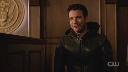 Jean has to ask if Ollie’s the Green Arrow, and when he admits it, she suggests a new strategy: admit that on the stand and use his good acts as defense against the prosecution. Ollie sees that if he goes public, it would destroy any chance he has at a normal life ever again. So now Felicity gets called to the witness stand, and while she defends Ollie, she is questioned about not knowing her dad was a known cyber criminal. Then, it’s Ollie’s turn, and while he admits the Green Arrow and The Hood are the same person, he won’t reveal who it is. But when confronted with a photo on him in Russia before he ever was “found” on Lian Yu (you remember that dangling thread from last season? No? Me neither.), it calls into question what else he’s lying about. Before we can follow that up, someone comes falling through a courthouse skylight! It’s someone in the Green Arrow suit, and it’s…well…