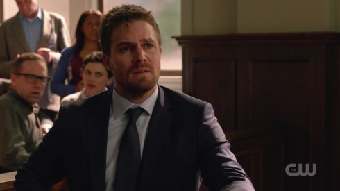 Rebuttal. Evil Laurel is put up on the witness stand, and there she is asked if Ollie is the Green Arrow. She says he isn’t. Well, that’s a shock to everyone, and afterwards, even Quentin wasn’t sure she would do that. She says she does finally need to stand up to Diaz, and we’ll see where that goes later. Meantime, Both sides give their closing arguments, and while we wait to hear what the verdict is, Ollie tells William to be strong for Felicity since she might be taking care of him from now on, and that his dad will always love him. Well, that’s sweet.