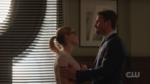 Later, Ollie pays a visit to Rene, who he wanted to thank for coming up with the idea to switch out the judge (and don’t forget possibly let himself be charged with perjury), and it looks like these two’s friendship might be on the mend. Somewhere else, Diaz is finishing up killing the judge in the case when Evil Laurel shows up, and yeah, he’s really pissed off. Well she attacks him and his men with her sonic screams, but when she’s about to do that sweet whisper of death into his ear, her power is shut off by one of those sonic dampeners. His men take her prisoner, and he says now he’s just gonna move on to Plan B: murder Team Arrow and everyone around them!