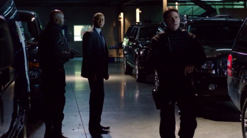 In our flashback, Ollie has put on that dead goon’s clothes, mask and all, and made his way into Fyers’ camp. Things are going okay, until he gets captured and imprisoned by Fyers…who happens to have a new henchman with him, being Ollie’s mystery archer buddy! That’s what he gets for trying to be a good guy. In the present, a string of well-planned armored car thefts points Ollie to a name on his list: Ted Gaynor, a private security man for Blackhawk. And maybe unfortunately, Ted was Diggle’s beloved commanding officer when he served in Afghanistan. That will make things awkward.