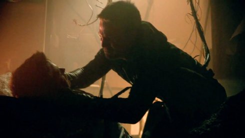 As Felicity helps Quentin talk through disarming the device, Ollie and Diggle arrive at Merlyn Global and confront Malcolm. That leads to an obligatory rooftop showdown between both archers, and Ollie finally turns the tables on his better opponent by stabbing Malcolm…through him! Hearing Quentin has managed to disarm the device, things look good…until Malcolm reveals before he passes out that he had an extra earthquake device made, just in case! That gets set off, and despite not being as horrifying as it would have been with both devices going off, there’s still damage, right around where Laurel’s law office is located! Laurel is trapped in the law center, until Tommy gets her out, then Ollie arrives to look for his friend in the building, only to find him impaled fatally. They both apologize to each other, but Ollie can’t save Tommy as he dies in his arms.