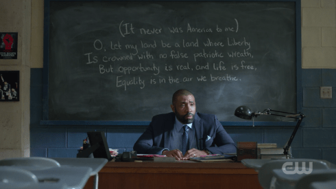 With Tobias Whale in police custody, you would think things would improve for the Pierce family and Freeland, but no. Jefferson is butting heads with Prinicpal Lowry over the new principal’s zero tolerance policy in Garfield High, and then learns the case against Tobias for murdering Jefferson’s dad will fail, even if Jefferson admits in court he did see it happen as a child. Before Tobias is let loose, he does have a meeting with a crime boss about blowing up a clinic that got a rather large cash donation from a super hero that ripped said crime boss off. So yeah, Anissa’s little Robin Hood thing last time has lead here, and now she needs her dad’s help.