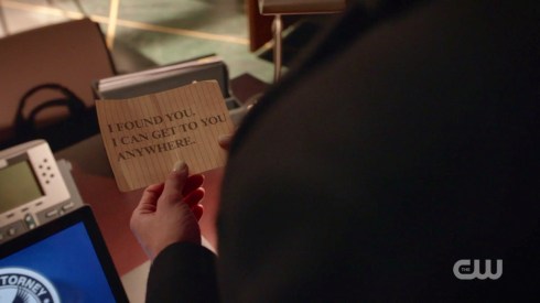 Speaking of wins, Evil Laurel learns from Dinah that the drunk guy was just that Earth’s version, and he’s in holding now for some unrelated crimes.Also, it’s not the Earth-2 version because Felicity asked her dimension hopping tech buddy, Cisco, to find out what happened and it turned out that guy didn’t die from Evil Laurel’s attack, but years later from natural causes. So, problem is solved. But if that’s the case, why does Dinah get a similar threatening note that Evil Laurel got after the case has been solved? We got a stalker on our hands!