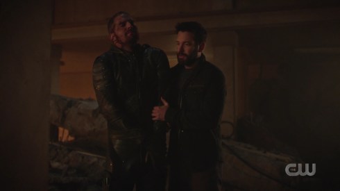 Tommy Boy. In the present, Ollie wakes up from that ceiling collapse to discover he’s pinned between two slabs of concrete, his gear scattered everywhere. He reaches out to get one of his trick arrows, when someone kicks it to him. And that someone is…Tommy Merlyn? Clearly Ollie is hallucinating him, but Ghost Tommy is able to break down the situation very succinctly: get out of that concrete sandwich, escape, but try not to bring the rest of the building down on your head while doing it, okay Ollie? Ollie uses the trick arrow to freeze and shatter the piece of rebar keeping him from escaping, and he gets out before the concrete can crush him. So far, so good, except his bow is busted, so he has to fix that before using some explosive arrows to escape.