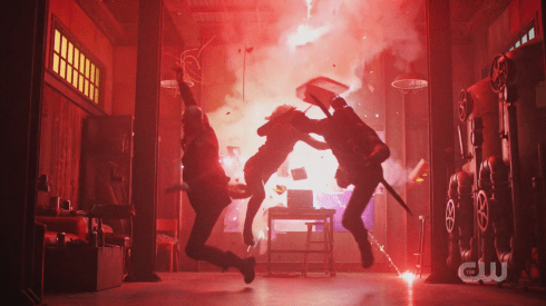 There’s an alert of an hostage situation at the police station, and the mercenaries there will only talk to mayor Quentin. While Quentin talks with the mercs, while Ollie sneaks around taking them out. When it seems the threat is neutralized, the lead merc says directly to Ollie that this won’t stop unless you, Oliver Queen, stop it. Then the merc detonates a large bomb, and…