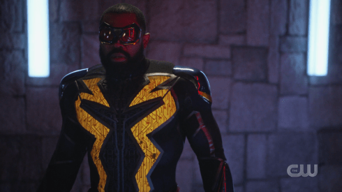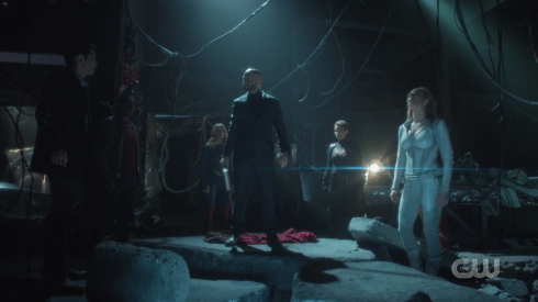 The remainder of Team Flash discovers that the Anti-Monitor antimatter machine is located under Capital City, in pretty much the same place Nash discovered it earlier this season on The Flash. Nash/Pariah shows up to help our heroes get into the room with the machine, which is helped by Cisco’s Vibe powers (oh yeah, almost forgot, The Monitor gave Cisco his powers back again earlier), and they find its being powered by a speedster on a treadmill…the Earth-90 Flash! The problem is they can’t break him loose without activating a failsafe that will make the machine just destroy all the Earths immediately. A surprise figure pops into the room: Black Lightning (which if you read the other Recap Round-Up post this week, now you know where we vanished to), who doesn’t have long to deal with the fact his Earth is gone before he’s asked to help out keep the antimatter generator failsafe from going off.
